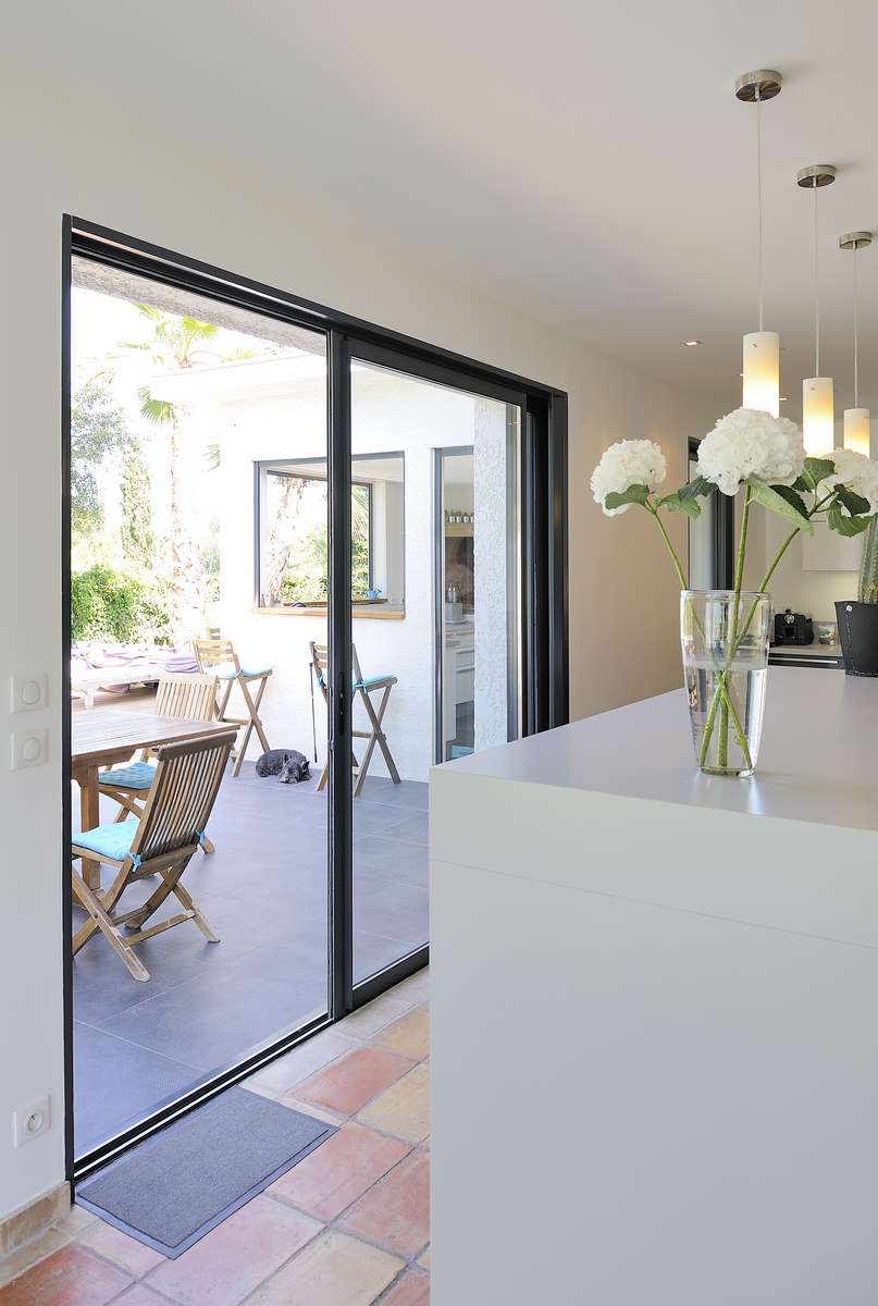 Coulissant à galandage 2vtx/2rails couleur N2100 sablé à sanary.Cette menuiserie à cette particularité de se refouler dans un seul mur ,ce qui peut être intéressant lorsque vous ne disposez pas de la place nécessaire des 2 côtés.Il a un autre avantage ,c'est que la masse centrale d'alu est moins importante (comme un coulissant simple) qu'un galandage monorail 2vtx.Par contre ,étant un peu plus épais (environ 5cm) ,il vous volera un peu plus de place dans la pièce.Vous pourrez constater le rail encastré dans le sol ,pratique de plus en plus courante que ce soit pour l'esthétique ou le confort de passage.