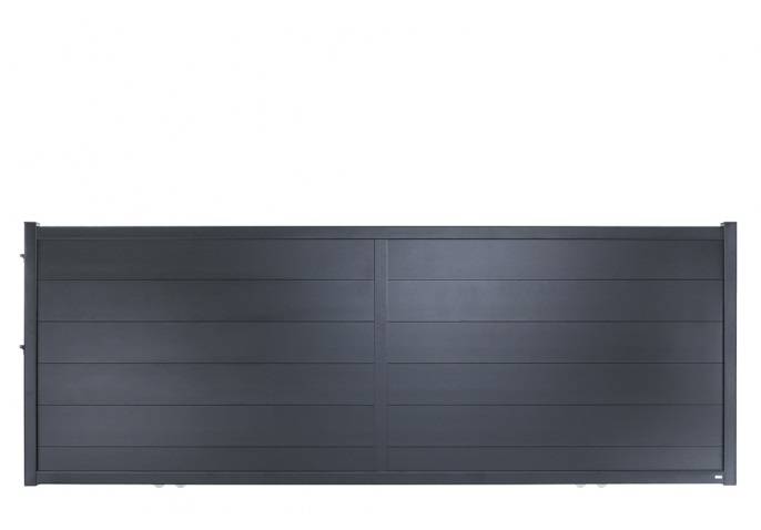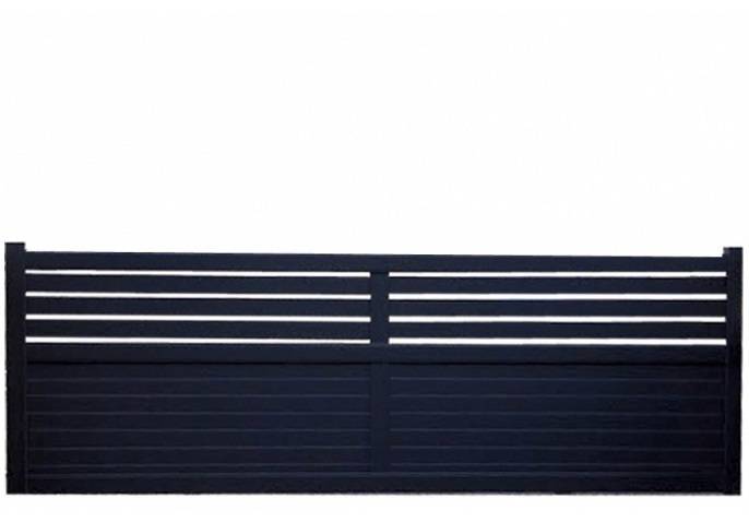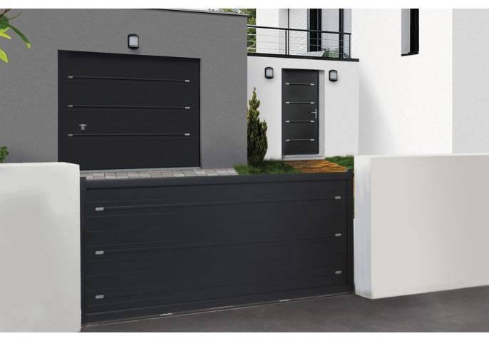 • portail plein fines lames horizontales : ce portail droit en aluminium est composé de fines lames horizontales, avec traverse verticale ou sans. Disponible en version portail battant ou coulissant, il est motorisable . Ce portail plein peut être laqué dans une autre finition.