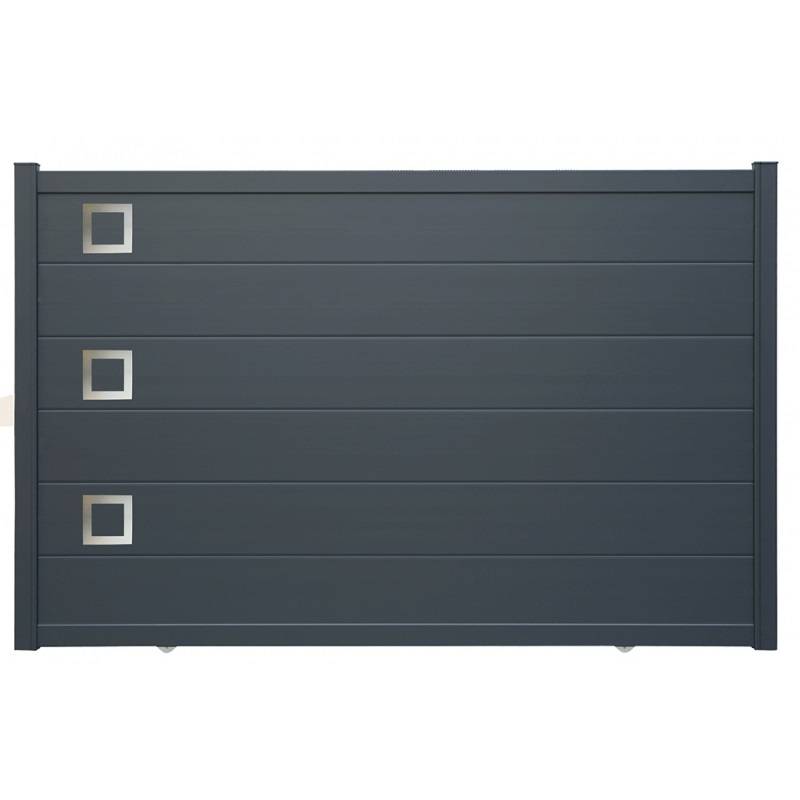 • portail plein avec inserts alu : portail moderne droit composé de larges lames horizontales d'inserts en aluminium à la forme carrée. Disponible en portail battant ou coulissant, motorisable et personnalisable.
